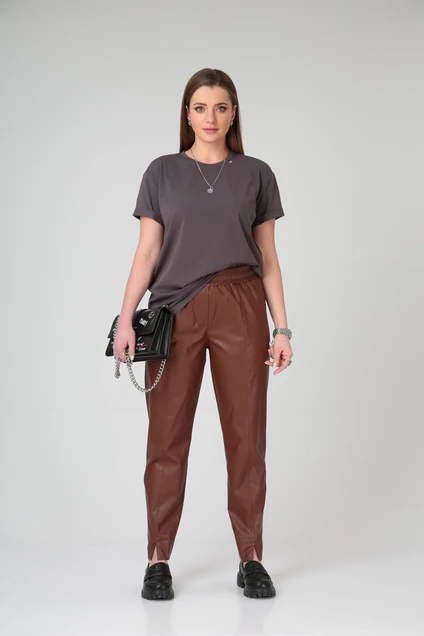 Брюки из эко-кожи на вискозной основе. Имитация застежки по центру переда, по передним половинкам в рельефных швах разрезы. Пояс шириной 5 см. на резинке по кругу. На задних половинках накладные карманы. Длина по боковому шву 103 см. По шаговому (внутреннему) шву 75 см.