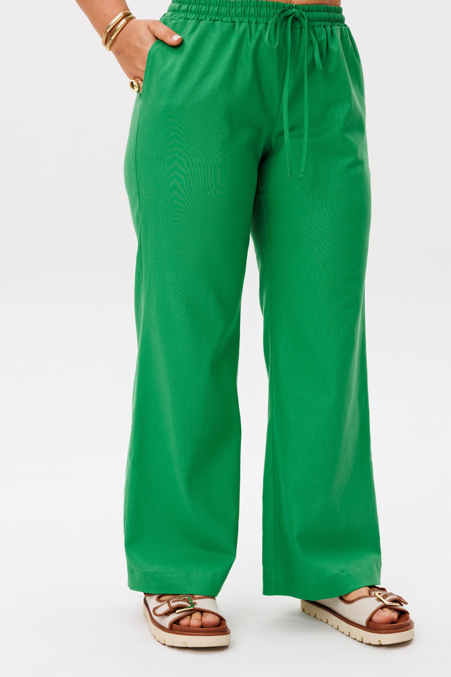 Льняные брюки свободного кроя с поясом на резинке, а для удобства в носке в пояс вставлен шнурок для регулирования объема по талии. Посадка брюк - высокая. По переду расположены карманы с наклонным входом. По низу широкая подгибка для возможности коррекции по длине. Брюки с хорошей посадкой, в этом и заключается их секрет универсальности и возможности носить их девушкам с любым типом фигуры.