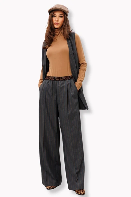 Брюки-палаццо на притачном поясе-резинке со шрифтовой композицией. По переду со складками, с имитацией застежки-гульфика и карманами в боковых швах.
