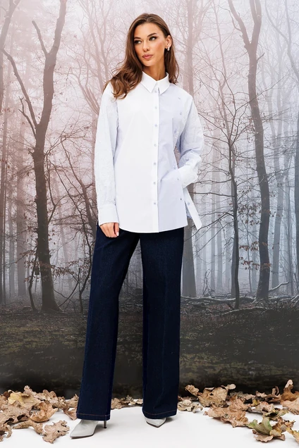 Брюки-джинсы, однотонные прямого силуэта. На приточном поясе со шлёвками, застежкой-гульфик. Пояс застегивается на петлю-пуговицу. Спереди карманы, сзади кокетка и накладные карманы.