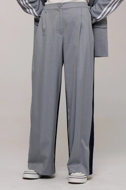 Брюки-палаццо, комбинированные из костюмной ткани по переду и джинса по спинке. Брюки на притачном поясе со шлевками и застежкой-гульфик. Пояс застегивается на петлю-пуговицу. По переду со складками и заутюженной стрелкой от одной из складок по всей длине брюк и карманами в боковых швах с наклонным входом. По спинке кокетка, накладные карманы и заутюженная стрелка.