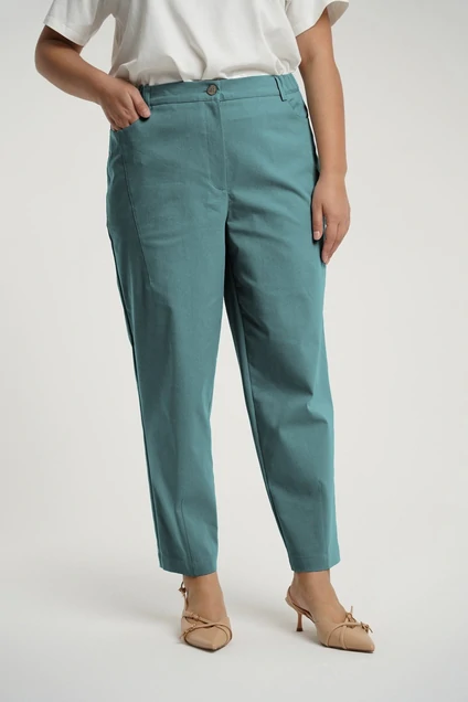 Брюки - бананы, зауженные к низу, с декоративными выточками по низу и колену. В боковых швах фигурные карманы. Пояс- отрезной с эластичной тесьмой. Застежка на молнию и петлю с пуговицей.