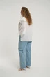 Джинсы классические прямые. Спереди фигурные карманы, сзади кокетки, накладные карманы. По передним и задним половинкам брюк рельефы с кантами с сырым срезом. Застежка на молнию и петлю с пуговицей. Пояс отрезной.