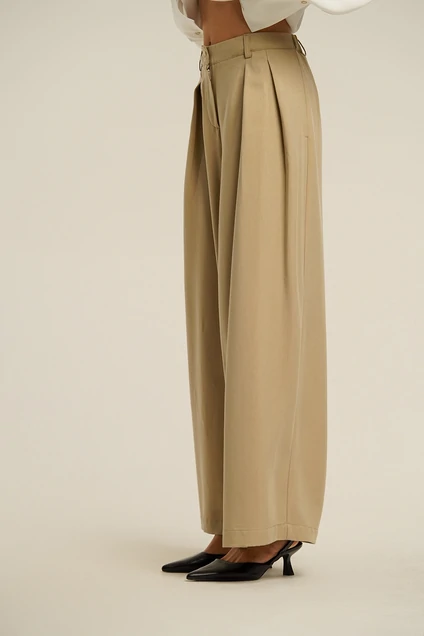 Элегантные брюки палаццо песочного цвета – идеальный выбор для создания безупречного образа. Модель выполнена из высококачественного материала, обеспечивающего комфорт и изысканную форму. Широкий отрезной пояс с эластичной вставкой сзади подчеркивает талию и обеспечивает идеальную посадку. Передняя часть декорирована аккуратными складками, добавляющими объем и динамичность образу. Функциональные карманы в боковых швах удобны для повседневного использования. Брюки застегиваются на молнию с петлей и пуговицей, что гарантирует легкость в использовании. Нейтральный оттенок позволяет сочетать их с различными элементами гардероба, будь то строгая блуза или легкий топ.