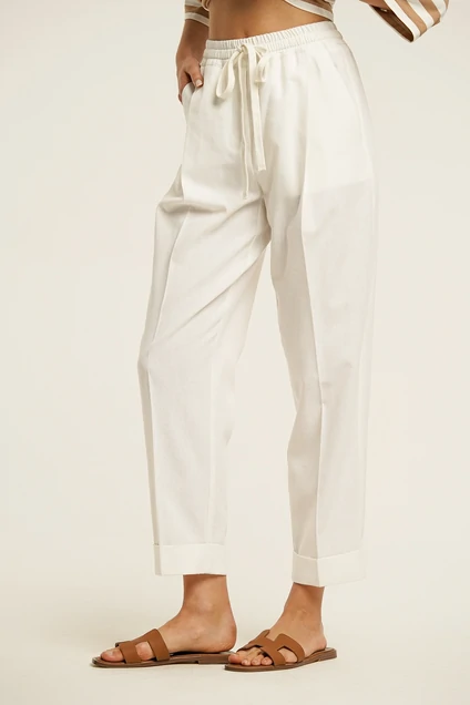 Брюки женские с средней посадкой слегка зауженные к низу. В боковых швах карманы с отрезным бочком. Пояс отрезной с эластичной тесьмой и регулируемыми шнурками. По низу манжет.