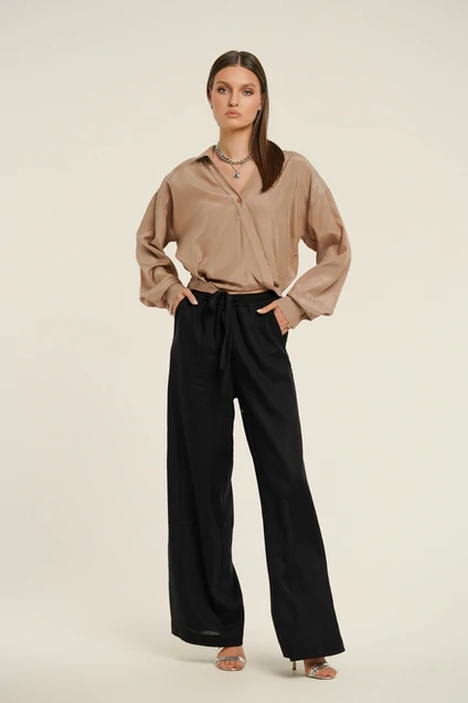 Брюки женские с средней посадкой, широкие. В боковых швах карманы с отрезным бочком. Пояс отрезной с эластичной тесьмой и регулируемыми шнурками.