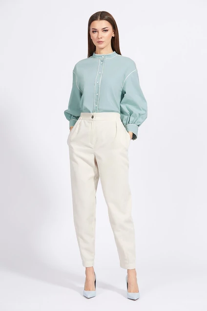 Брюки выполнены из однотонной плательно-костюмной ткани в рубчик "штрукс". Брюки покроя "багги", зауженные к низу. Застежка спереди на пуговицу и молнию с гульфиком. Брюки на притачном поясе, в который частично вставлена эластичная тесьма. Карманы боковые с наклонным входом. Сзади имитация карманов.