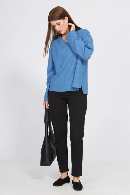 Брюки выполнены из джинса. Брюки на притачном поясе, длиной 7/8, заужены к низу. Застежка спереди на молнию с гульфиком и пуговицу. Спереди боковые карманы с фигурным наклонным входом. Сзади накладные карманы. В задней части пояса вставлена эластичная тесьма. Брюки декорированы нашивкой на заднем кармане.