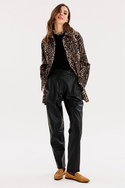 Брюки выполнены из экокожи. Брюки на притачном поясе, зауженные к низу. Спереди на уровне колен обработаны горизонтальные подрезы. Застежка спереди на молнию с гульфиком и пуговицу. В задней части пояса вставлена эластичная тесьма. Карманы боковые с наклонным входом.