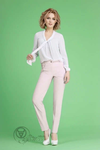 Брюки женские из плотной хлопковой ткани, прилегающего силуэта, с накладными карманами сзади, и обманками по переду. Брюки на притачном поясе. С застежкой петля-пуговица. Низ брюк декорирован разрезами. Длина изделия-95 см.