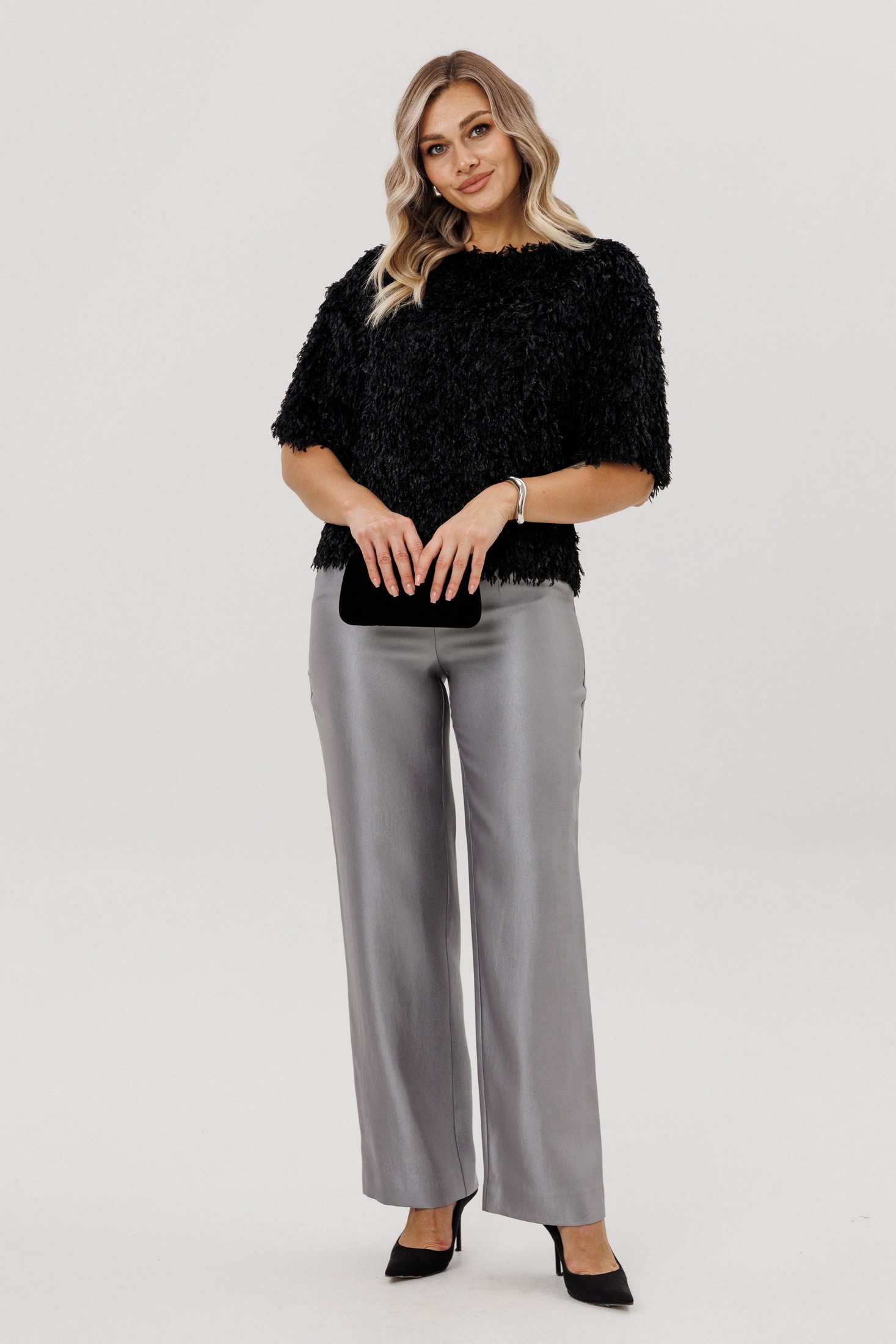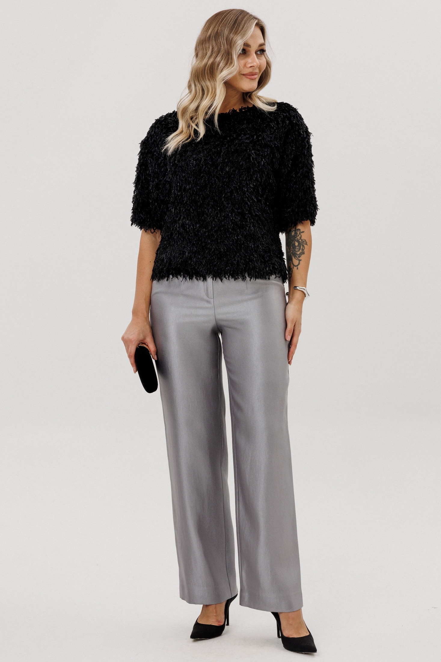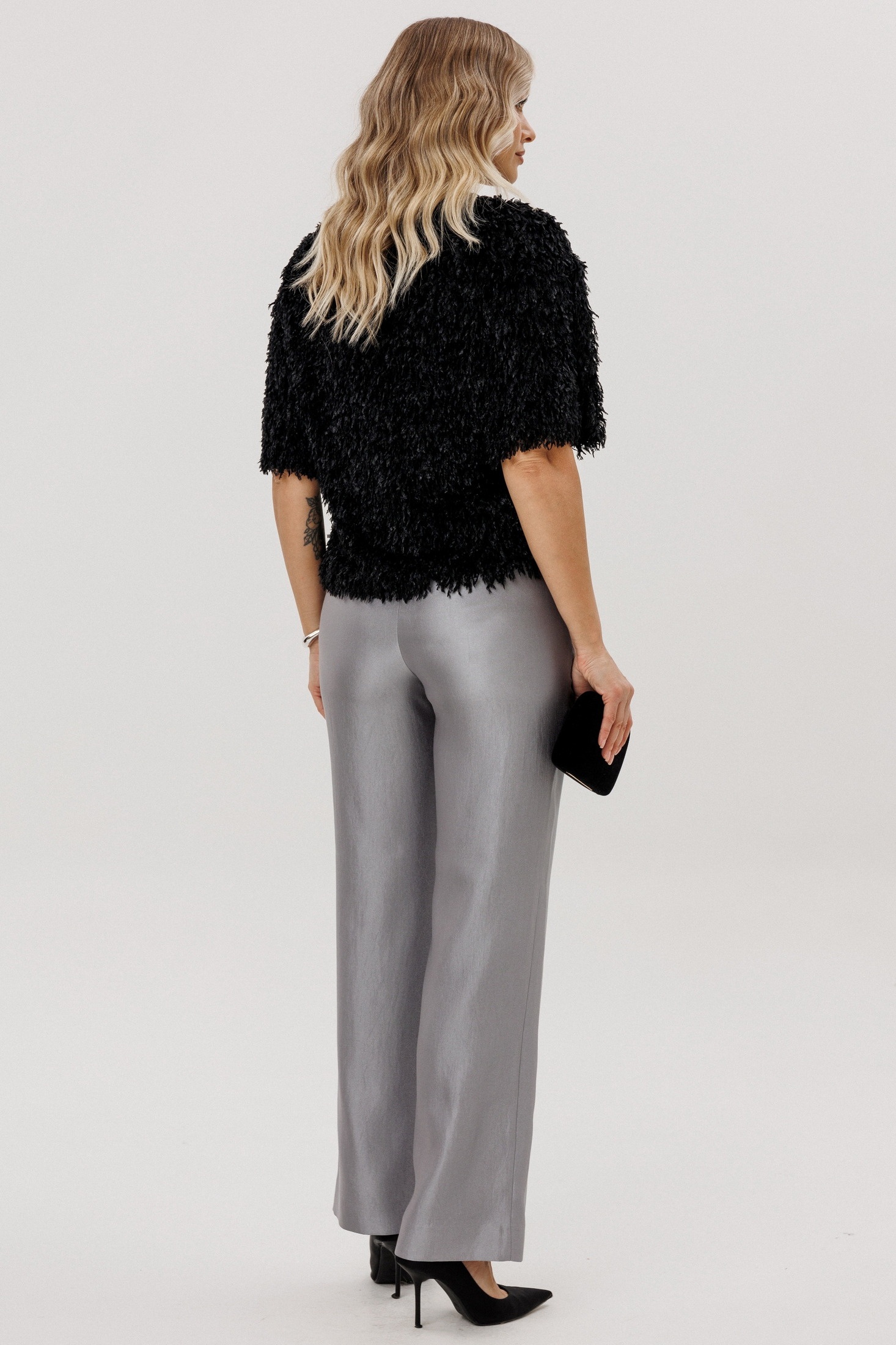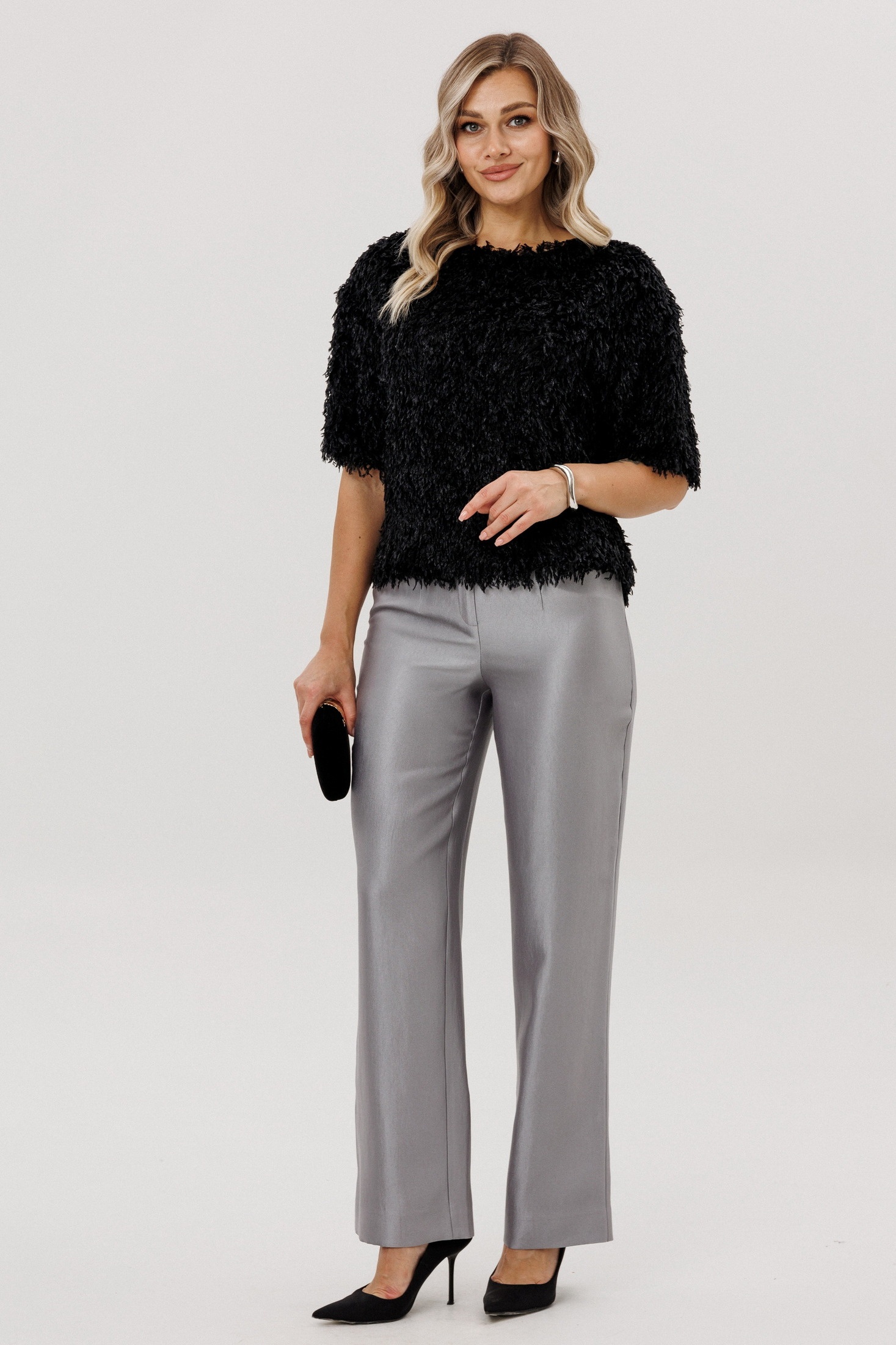 Элегантные серые брюки из костюмной ткани представляют собой идеальный выбор для деловых встреч и официальных мероприятий. С полуприлегающим силуэтом эти брюки подчеркнут вашу фигуру без лишнего украшательства. Отсутствие карманов на задней части обеспечивает гладкость и чистоту линий, что делает этот элемент гардероба идеально подходящим для создания строгого и утонченного образа.