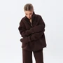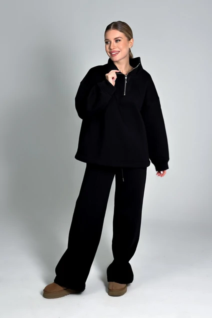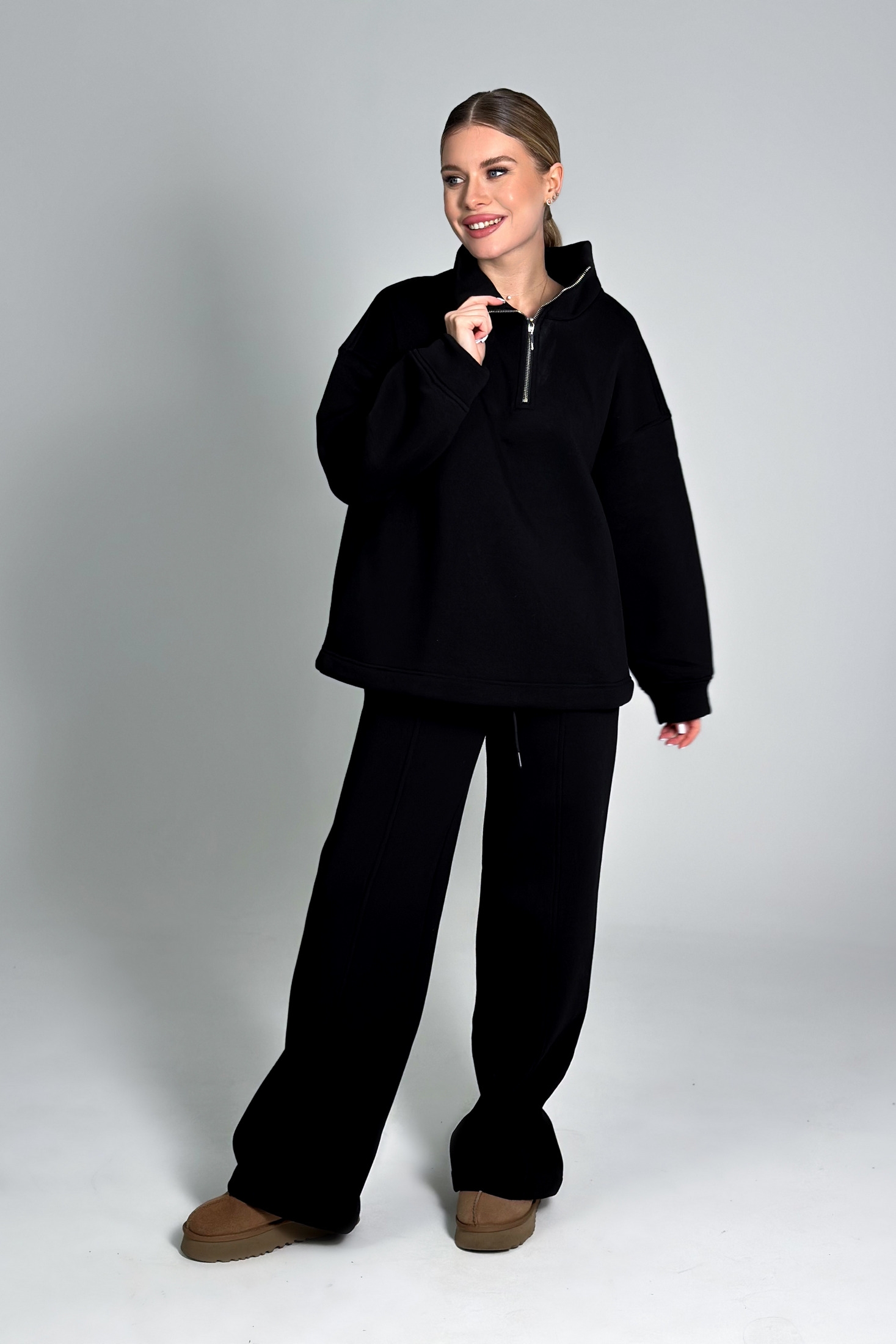 Брюки палаццо прямого кроя обладают стильной шириной по низу (30–31 см ½) и рельефным швом по центру переда. Низ брюк можно регулировать с помощью резинки-жгута и фиксаторов, что позволяет адаптировать посадку и силуэт. Удобные угловые карманы, обработанные в боковых швах, завершают образ и делают модель практичной для повседневной носки.