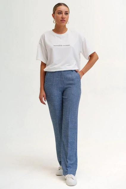 Эти женские брюки прямого кроя - идеальный выбор для создания стильного и комфортного образа. Умеренная ширина брючин позволяет сочетать их с любой обувью - от каблуков до кед. Пояс притачной со шлевками обеспечивает надежную посадку на талии, а сзади пояс эластичный для дополнительного комфорта. Боковые карманы с отрезным бочком добавляют брюкам функциональности и практичности. Интересный принт на плотной костюмной ткани делает эти брюки не только удобными, но и привлекательными. Эти брюки идеально подойдут для работы, деловых встреч или вечернего выхода. Благодаря своей универсальности, они станут незаменимой вещью в вашем гардеробе!