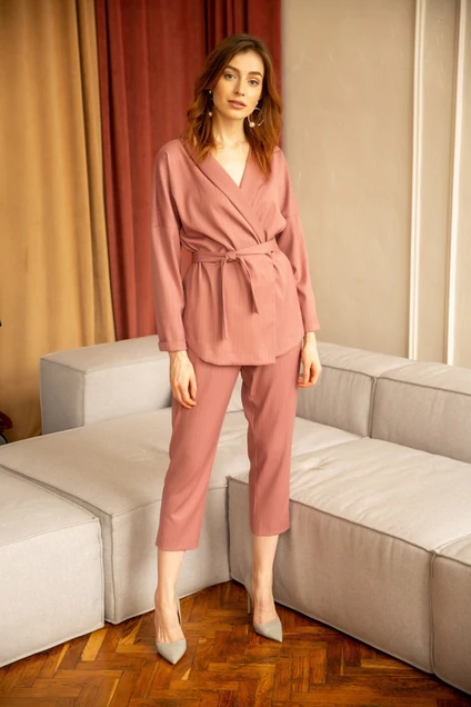 Кюлоты зауженные к низу, пояс на резинке. На передних частях брюк боковые карманы с отрезным бочком. С жакетом арт.535 брюки создают образ для деловой встречи или вечернего выхода.