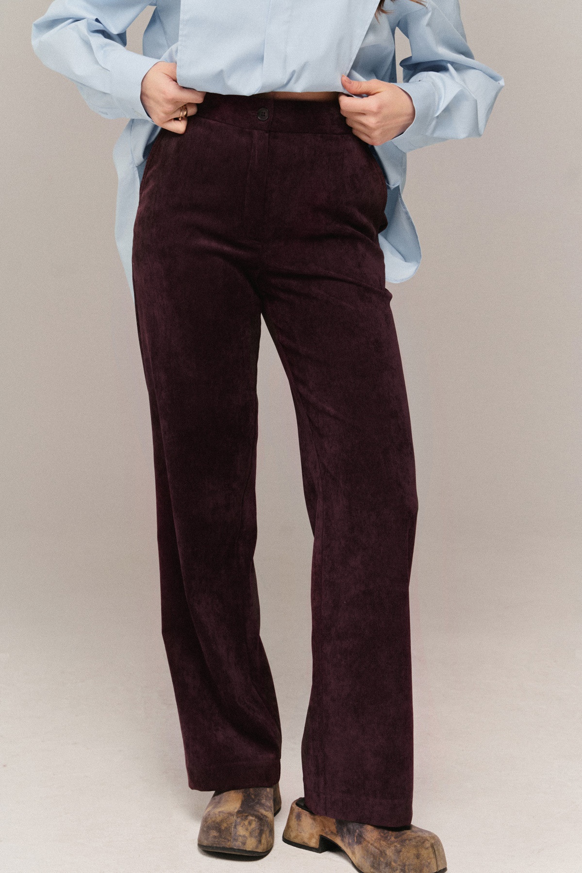Брюки молодежные из ткани однотон микро вельвет ,на притачном поясе прямого силуэта, с наклонными карманами и застежкой "гульфик" по переду, по ЗП 2 талиевые вытачки.