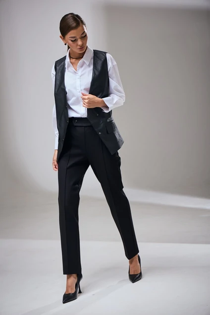 Брюки женские прямого силуэта, слегка заужены к низу. По переду отстрочены стрелки, имитация гульфика. Пояс притачной с резинкой по бокам и спинке, декорирован отстрочной патой. Декоративные элементы и фурнитура могут отличаться от заявленных на фото. Длина брюк по боковому шву 104 см