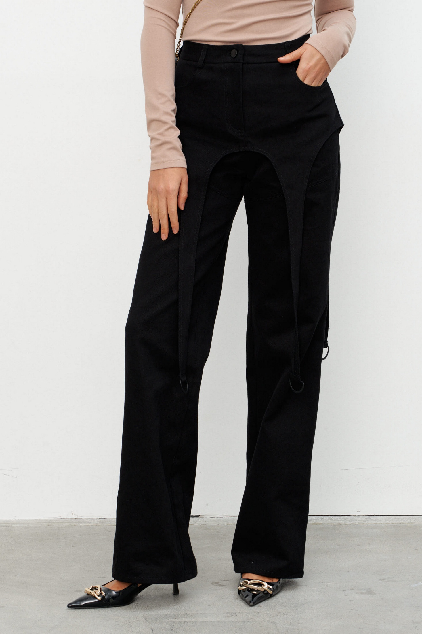 Брюки прямого силуэта из плотного джинса с баской. Брюки на поясе со шлёвками и застёжкой на пуговицу-болт и молнию. Чуть ниже шва сидения идут подрезы имитирующие по форме мини-шорты. По переду два прорезных кармана, по спинке - два накладных. Длина брюк от талии 44-48р - 112 см 50-54р - 113см