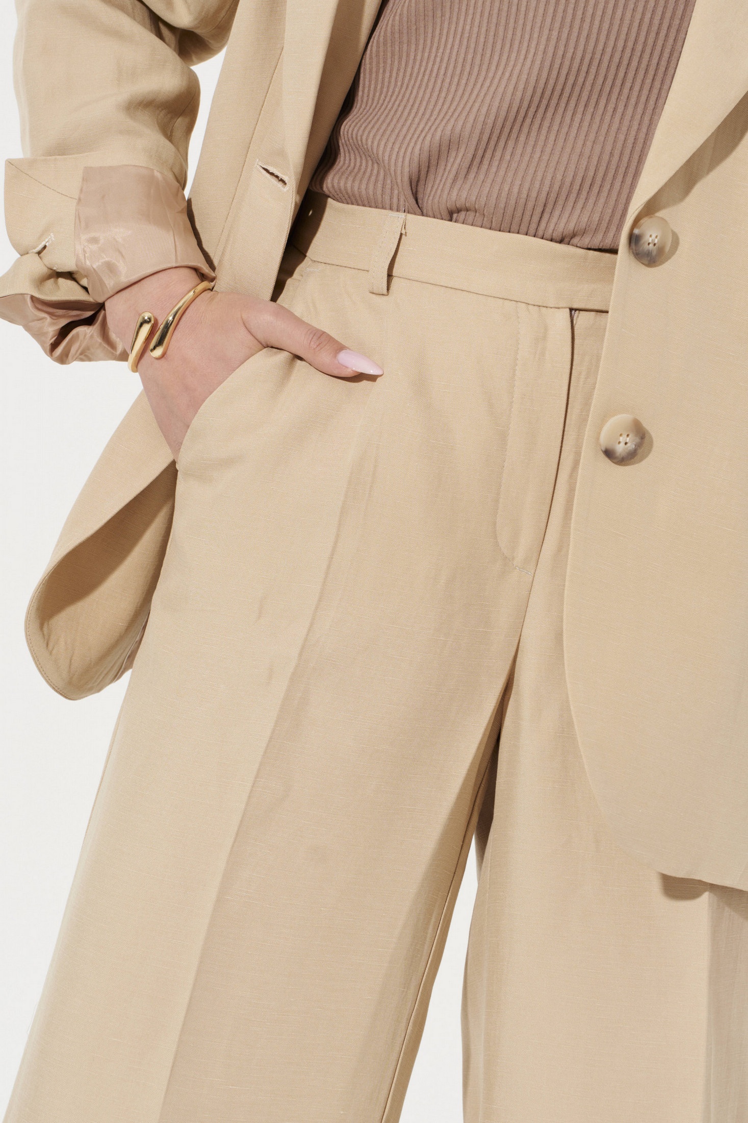 Брюки женские прямые из смесовой ткани с добавлением льна для повседневной носки. Верхний срез брюк обработан притачным поясом, застежка на один крючок, а также имеется застежка на тесьму-молнию в среднем шве брюк. Пояс брюк имеет шлевки, что дает возможность носить с ремнем. Задняя часть брюк имеет талиевые вытачки. В брюках расположен в боковом шве карман с подкройным бочком. Отличный классический вариант брюк, который станет базовой вещью в вашем гардеробе.