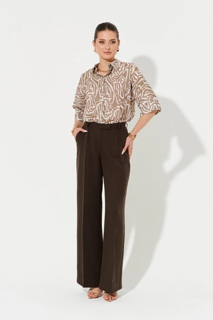 Брюки женские прямые из смесовой ткани с добавлением льна для повседневной носки. Верхний срез брюк обработан притачным поясом, застежка на один крючок, а также имеется застежка на тесьму-молнию в среднем шве брюк. Пояс брюк имеет шлевки, что дает возможность носить с ремнем. Задняя часть брюк имеет талиевые вытачки. В брюках расположен в боковом шве карман с подкройным бочком. Отличный классический вариант брюк, который станет базовой вещью в вашем гардеробе.