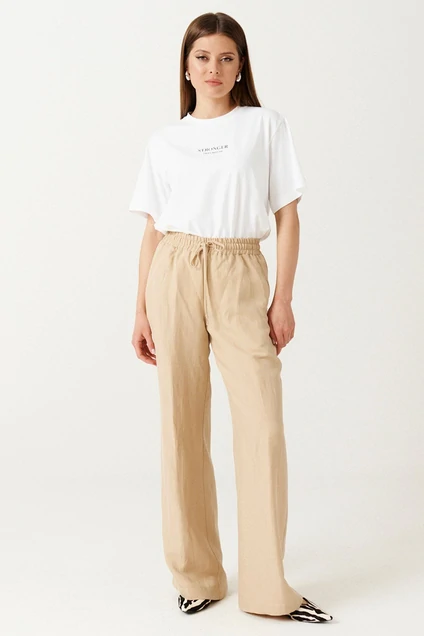 Брюки прямого кроя на резинке выполнены из льняной ткани. Характеристики: Прямой крой, прорезные карманы в боковых швах. Длина классическая.