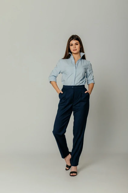 Классические брюки синего цвета. В боковых швах функциональные карманы, на передних половинках заложены мягкие складки. По спинке в пояс вставлена резинка. Длина 98 см