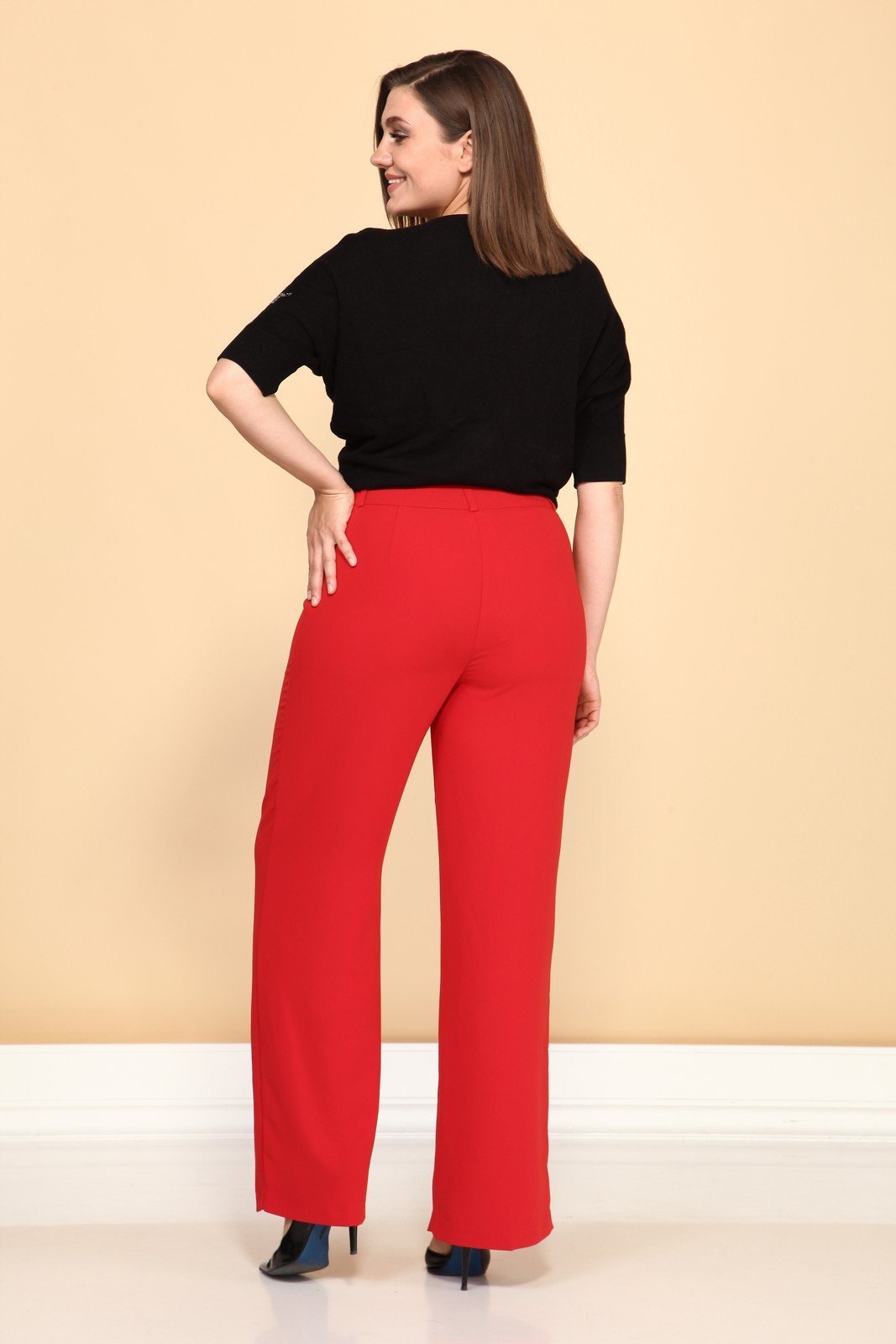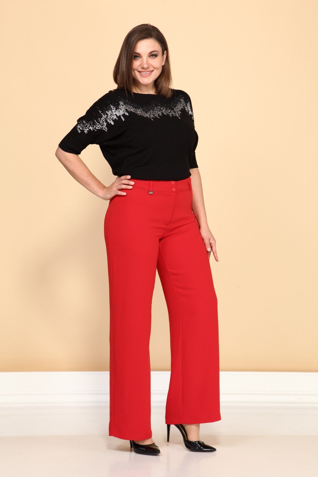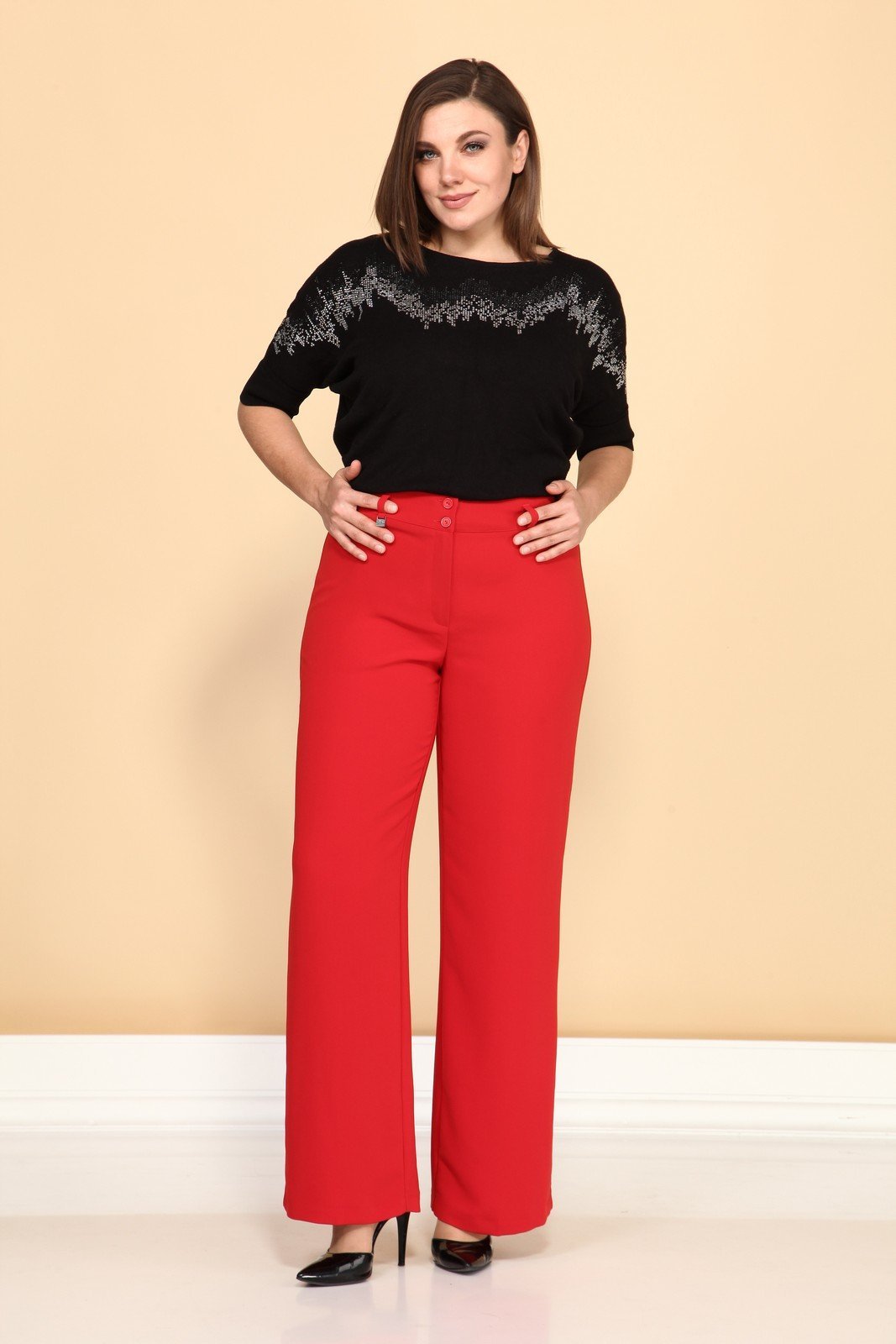 Брюки женские облегающие в области бедер, прямые от бедра. Застежка молния, пуговица.Спинка с двумя вытачками. Длина шагового шва 82 см. Бережная стирка при 30 градусах!