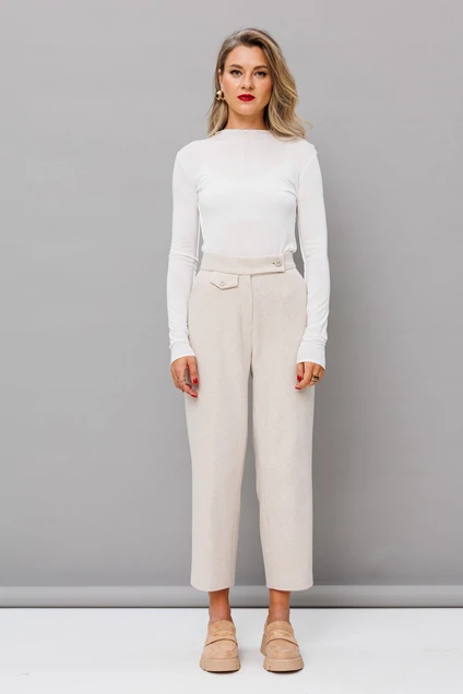 Лаконичные прямые брюки — основа базового гардероба. Выполнены из плотной ворсистой ткани на основе вискозы, дышащей и приятной к телу. Отрезной пояс обеспечивает комфортную посадку по фигуре. По переду и сзади - декоративные клапаны декорированные пуговицами. Длина брюк - 98 см.