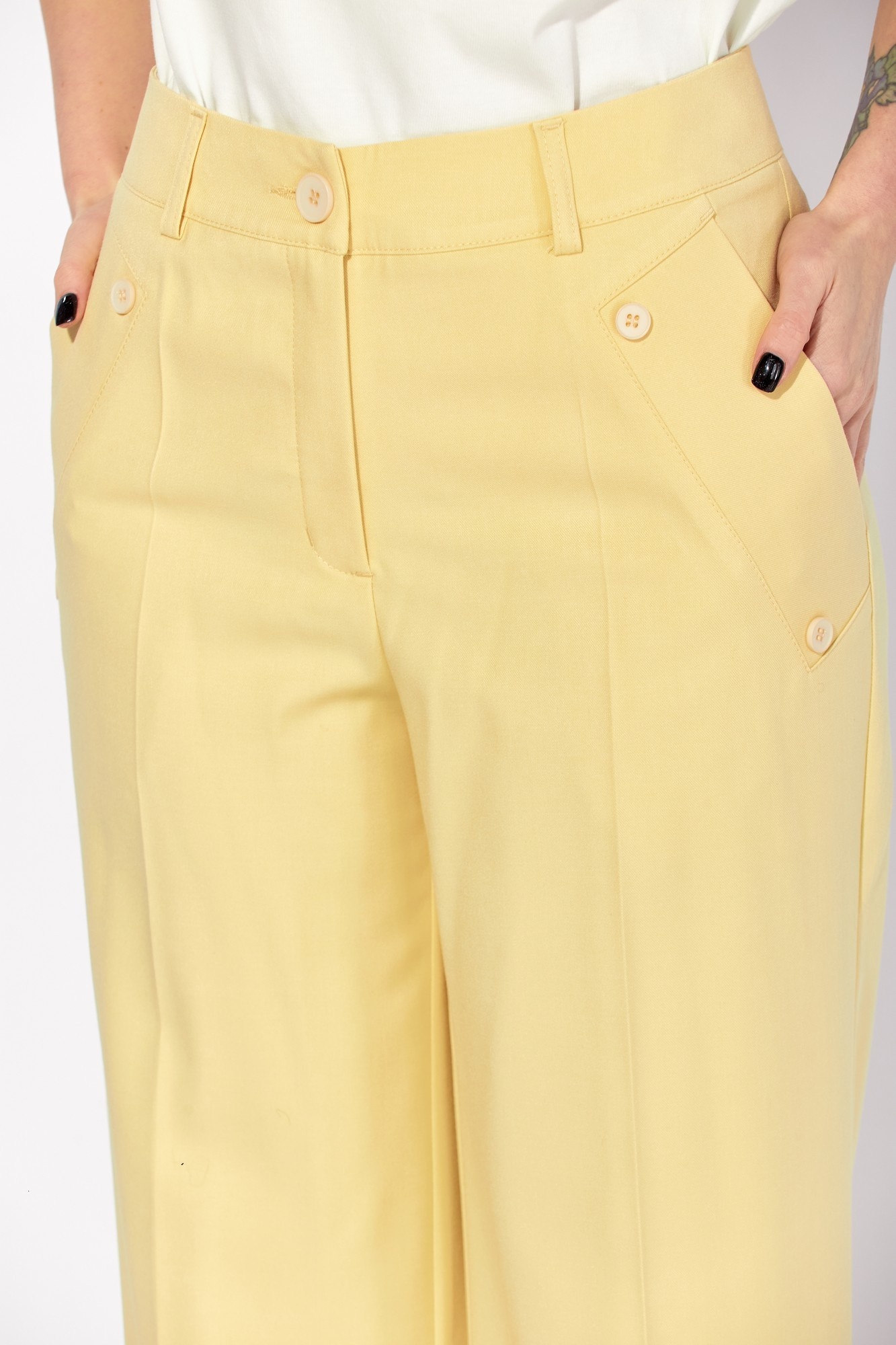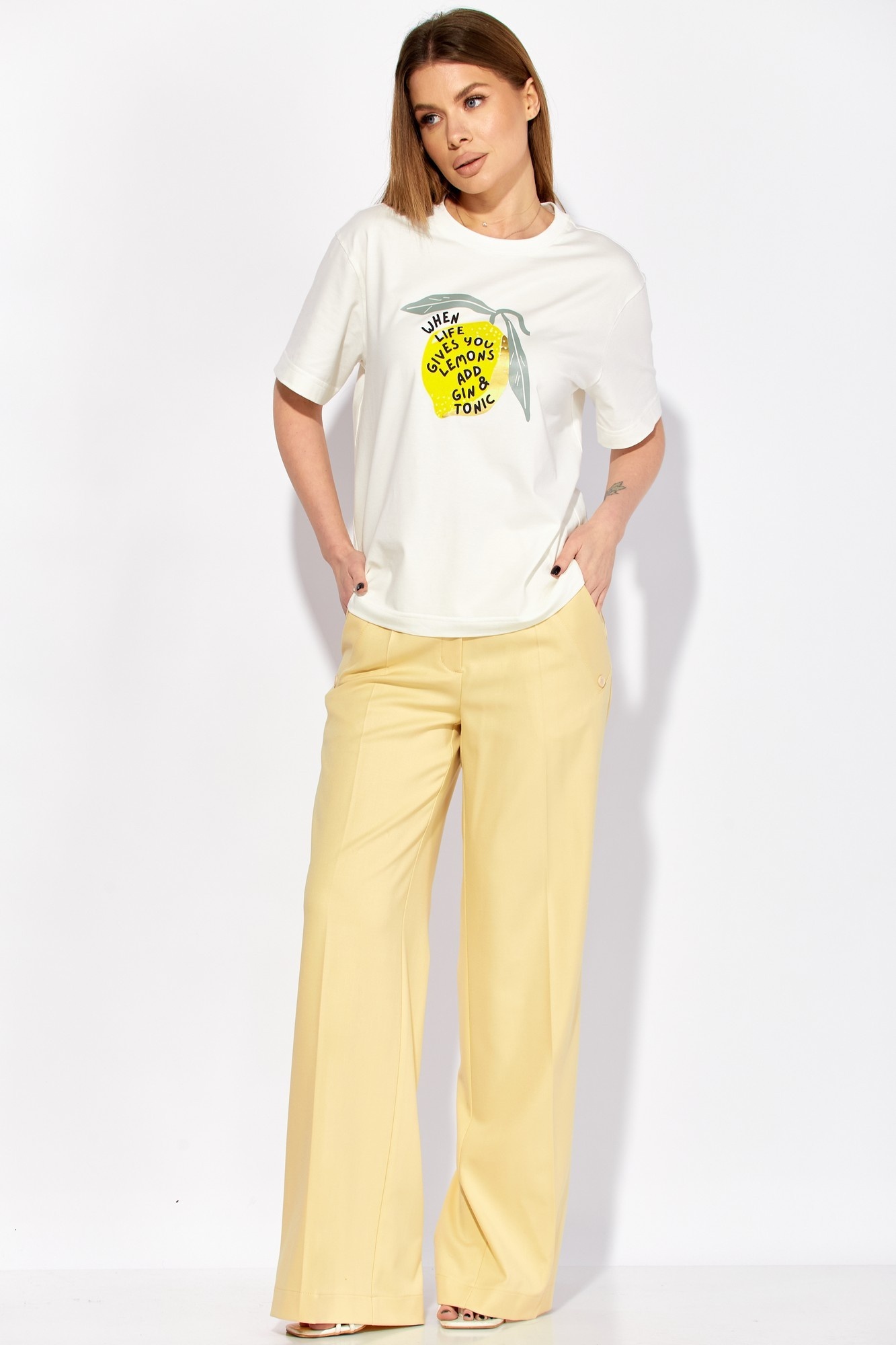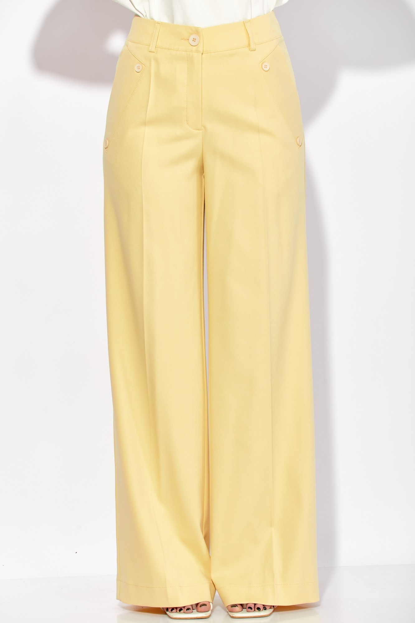 Брюки 942-2 сливочный LAIKONY от бренда LAIKONY — это идеальный выбор для создания базового гардероба. Коллекция бренда представляет стильные широкие брюки из полиэстера, вискозы и спандекса, обеспечивающие комфорт и легкость движения. Брюки имеют притачной пояс с шлевками, застежку на тесьму-молнию и пуговицу, что добавляет удобства в использовании. Наклонные карманы с декоративными пуговицами на передних частях придают уникальность дизайну. Универсальный сливочный цвет и длина изделия по боковому шву 111 см делают эти брюки отличным выбором для весенне-летнего сезона. Модная деталь вашего повседневного или офисного образа, которая легко сочетается с другими элементами гардероба.