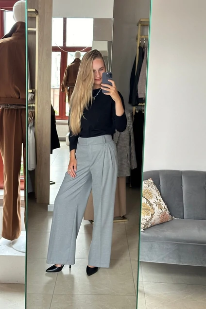 Комфортные брюки-палаццо на высокой посадке с широким поясом и защипами на талии выполнены из плотного и приятного к телу материала. Элегантное изделие дает полный простор для фантазии, ведь носить их можно с любым верхом в деловом, повседневном и вечернем стиле.