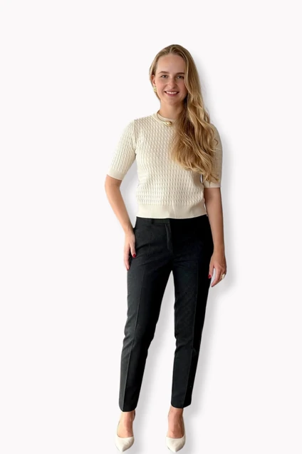 Брюки застёгиваются на молнию и потайные крючки. Пояс дополнен шлёвками для ремня. По бокам расположены карманы.