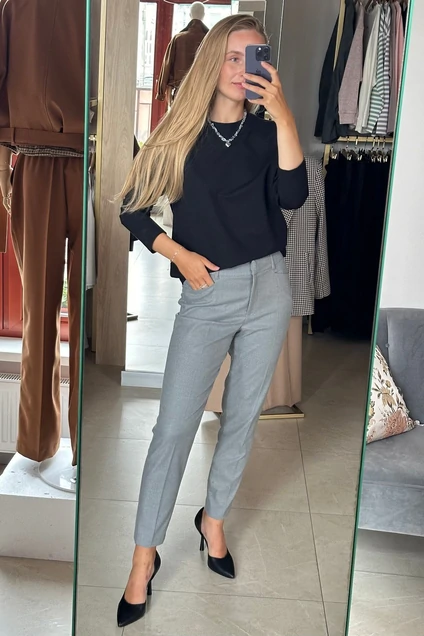 Брюки застёгиваются на молнию и потайные крючки. Пояс дополнен шлёвками для ремня. По бокам расположены карманы