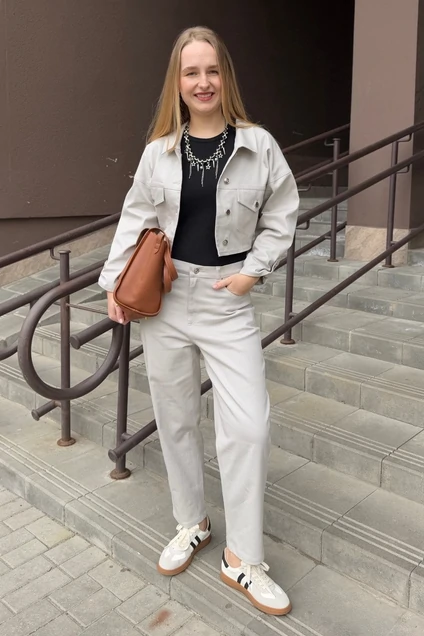 Особенности: высокая талия, классический крой, качественный деним, удобные карманы, модный цвет капучино.