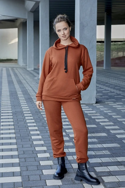 Брюки в спортивном стиле из трикотажного полотна (трехнитка), прямого силуэта, зауженные книзу, с широким поясом на резинке. В боковых швах обработаны функциональные карманы. Низ брюк на резинке.Длина брюк: 109 см