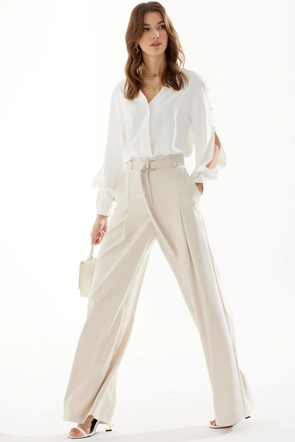 Стильные широкие от бедра брюки прямого силуэта из костюмной ткани. Верхний срез обработан притачным поясом с застежкой на петли и пуговицы и шлевками для пояса. Передние половинки брюк с наклонными карманами и складками, ребра которых направлены в сторону боковых швов. Задние половинки брюк с талиевыми вытачками и декоративными листочками. В комплект входит ремень из основной ткани. Длина изделия: 111 см