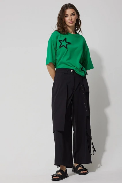 Укороченные брюки прямого силуэта из хлопковой ткани. По верху брюк притачной пояс с застежкой на петлю и пуговицу и шлевками для ремня. А спинке по поясу вставлена эластичная тесьма (резинка).По переду ассиметричные функциональные карманы и декоративный элемент на полукольцах. По низу декоративный карман с клапаном и декоративной патой на полукольца. На спинке вытачки. По низу брюк вставлен эластичный шнур с фиксаторами для формирования разной степени прилегания. Обращаем ваше внимание, что фурнитура может незначительно отличаться от фото. Длина изделия: (44-48р - 95см +4см пояс),(50-54р - 96см + 4см пояс),(56-60р - 97см +4см пояс)