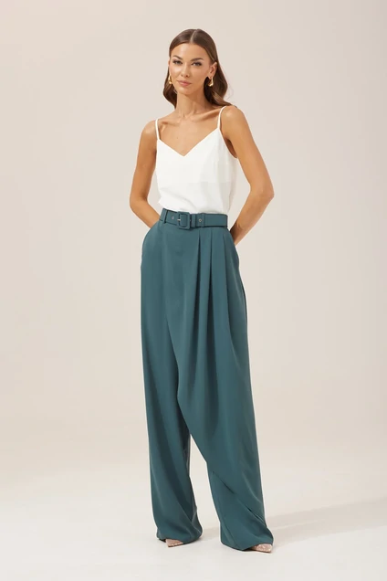 Нарядные брюки прямого силуэта, расширенные книзу. По переду брюк расположена отлетная деталь, с декоративными складками. В боковом шве расположена потайная молния. В 50-54р на спинке в пояс брюк вставлена эластичная тесьма(резинка). В комплект входит съемный ремень. Обращаем ваше внимание, что фурнитура может незначительно отличаться от фото. Длина брюк 114см + 4см пояс