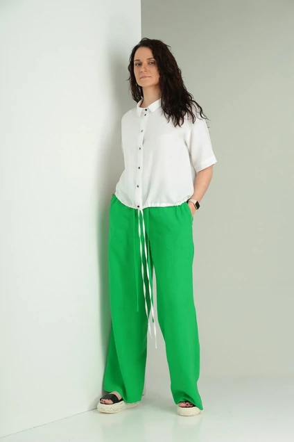 Комфортные, свободные брюки прямого силуэта с боковыми карманами. Без застежки , пояс на резинке. Длина брюк от верхнего края пояса 107 см..