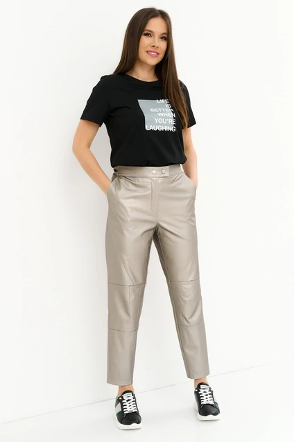 Стильные брюки из экокожи, свободного кроя, слегка заужены к низу, с притачным поясом. Пояс дополнен эластичной тесьмой. Посадка средняя. Брюки дополнены боковыми карманами. Застежка на металлические кнопки и молнию. Длина брюк по боковому шву 94 см
