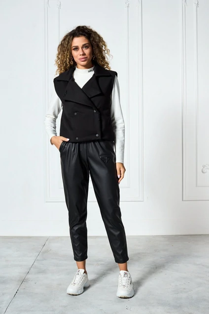 Брюки спортивного кроя из эко-кожи, пояс на резинке. По переду боковые карманы, к низу брюки слегка заужены. На левой передней половинке выполнен декоративный элемент с металлическим пришивным украшением. На поясе так же декоративная нашивка. Низ брюк на подгибке.