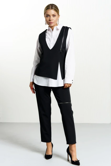 Брюки свободного кроя со складками и карманами по переду. Пояс притачной со шлевками. Низ на подгибке. Застёжка центральная на гульфик и молнию. На правой брючине в низу в боковом шве — молния, на левой — выше колена декоративный разрез и действующая молния!