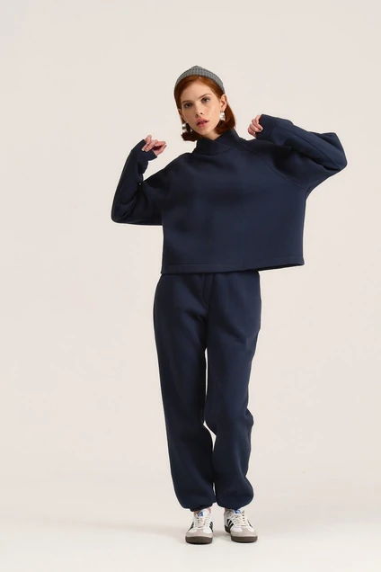 Джоггеры свободного силуэта умеренно зауженные к низу, представлены в трёх цветах. Выполнены из трикотажного полотна футер 3-х нитка с начёсом. Передние части с фигурными карманами и имитацией застёжки. На задней правой части накладной карман, декоративный флажок с печатью. Пояс и низ на эластичной тесьме. Такие джоггеры универсальны для прогулок, путешествий, спорта и дома.