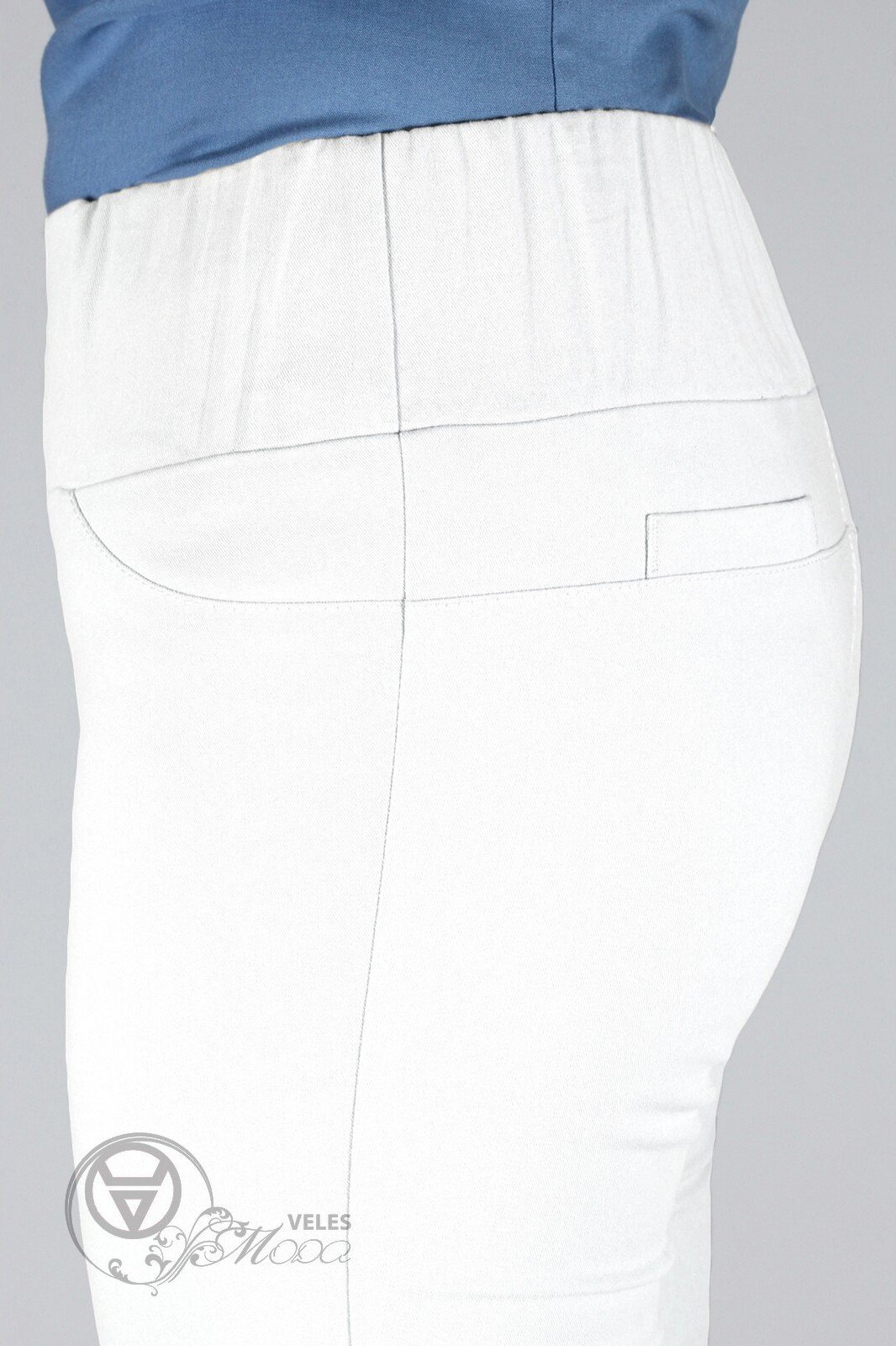 Брюки весенне-летнего ассортимента, зауженные к низу. Брюки без молнии. По всей длине пояса вставлена резинка ( 7 см) . Посадка : Р-ры 46,48 -средняя Р-ры 50-62- высокая. Ткань эластичная, тянется (Эластан 3%).