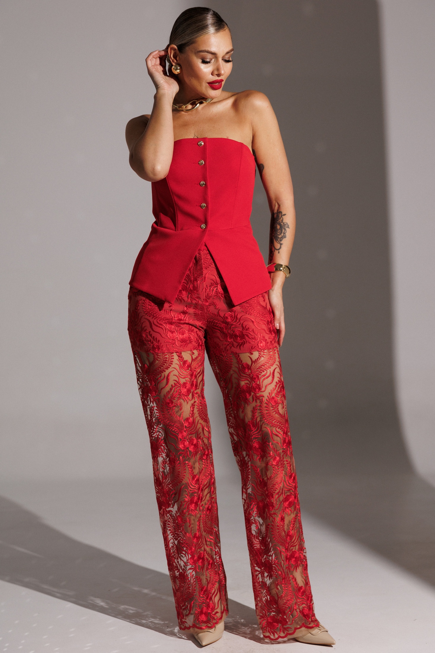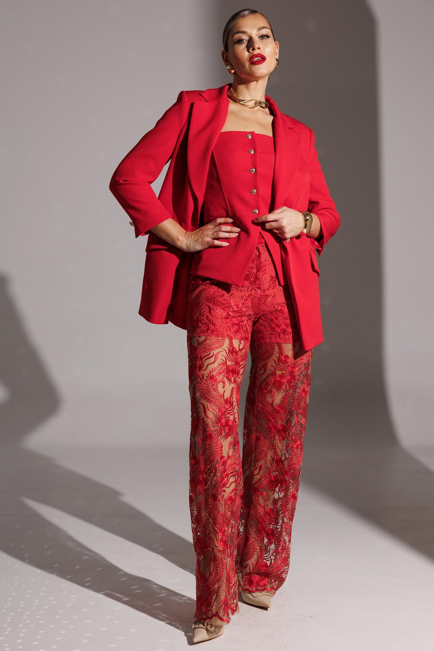 Капсула RED CODE - Ваша формула смелого праздника. Она создана для особых случаев включает в себя жакет, корсет и брюки, создавая элегантный и стильный образ. Брюки двухслойные, свободного силуэта. Нижняя часть представляет собой короткие шорты. Верхний слой выполнен из прозрачного гипюра с изысканной каймой по низу, что придает изделию особую утонченность. Верхний срез обрабатывается обтачкой. Молния сбоку.Мы собрали все элементы новогодней коллекции в единую капсулу, где каждая вещь - не просто предмет гардероба, а часть большой стилистической головоломки. Собирайте образы как конструктор, меняйтесь в течение вечера и будьте неотразимы в каждой роли! длина юбки по боковому шву: 115 см