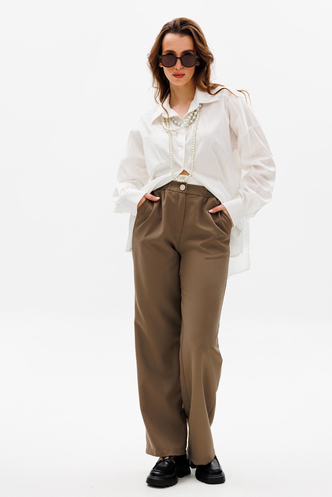 Брюки прямого силуэта с вытачками по задней половинке. Наклонные карманы в боковых швах по передней половинке изделия. Застёжка на тесьму-молнию с резинкой по поясу. Отделочная деталь пояса на резинке из рубашечной ткани создаёт имитацию двойного пояса. Вставка 100% хлопок