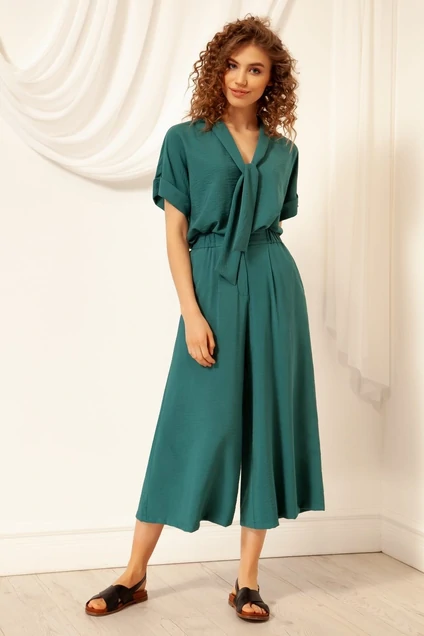 Кюлоты свободного силуэта из вискозной ткани расклешенные от бедра, на поясе с небольшими складками по переду и боковыми наклонными карманами. Застежка по поясу с гульфиком на молнию и пуговицы. Пояс на резинке по спинке и частично по переду.