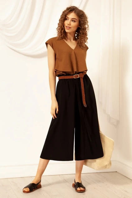 Кюлоты свободного силуэта из хлопковой ткани расклешенные от бедра, на поясе с резинкой и боковыми наклонными карманами. По поясу спереди кулиса с завязывающимся поясом.
