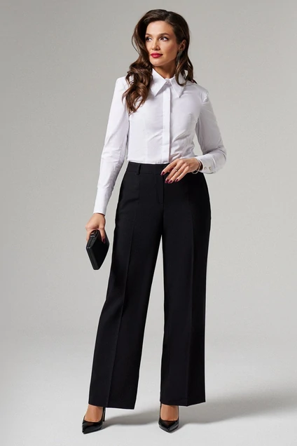 Классические женские брюки клеш станут находкой для делового и повседневного гардероба. Широкие брюки со стрелками будут уместны и на городской прогулке, и на официальной встрече в офисе. Благодаря универсальному дизайну и клешу от бедра, женские брюки больших размеров визуально вскрывают лишние сантименты и делают силуэт стройнее. Застежка-молния гармонично дополнена шлевками для дополнения модели кожаным или текстильным ремнем. Брюки черные прекрасно будут сочетаться с блузами, рубашками, джемперами. Вы можете заказать широкие штаны женские из качественного материала по выгодной цене.
