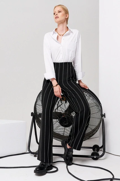 Женские брюки в полоску - стильное решение для создания летних образов. Они классические, хорошо садятся по фигуре. Брюки с высокой талией оказывают легкий эффект подтяжки, формируя красивую линию живота. Их можно сочетать с топами, футболками, блузками, рубашками. Модные брюки можно носить в повседневной жизни, создавать с их помощью деловые, нарядные образы. Брюки трикотажные женские приятные на ощупь, легкие, дарят комфорт.