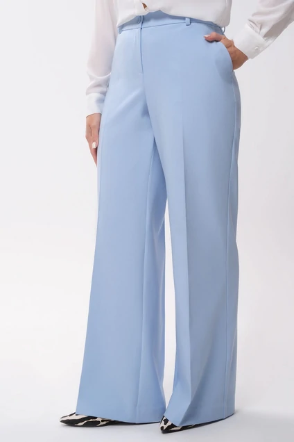 Брюки женские из костюмной ткани для повседневной носки. Силуэт расширяется к низу. На передней части брюк карманы. Брюки с отрезным поясом, застегивающимся на тесьму--молнию и пуговицу. В заднюю часть пояса вставлена резинка, есть шлевки. На задней части брюк есть прорезной карман.