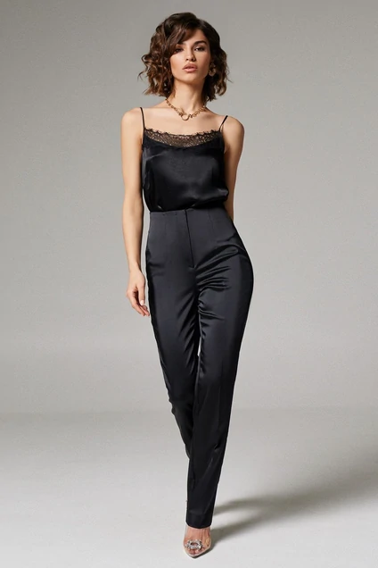 Элегантные женские атласные брюки - идеальный выбор для тех, кто хочет выглядеть модно и стильно. Черный цвет делает их универсальным вариантом, который легко сочетается с различными верхами и обувью.